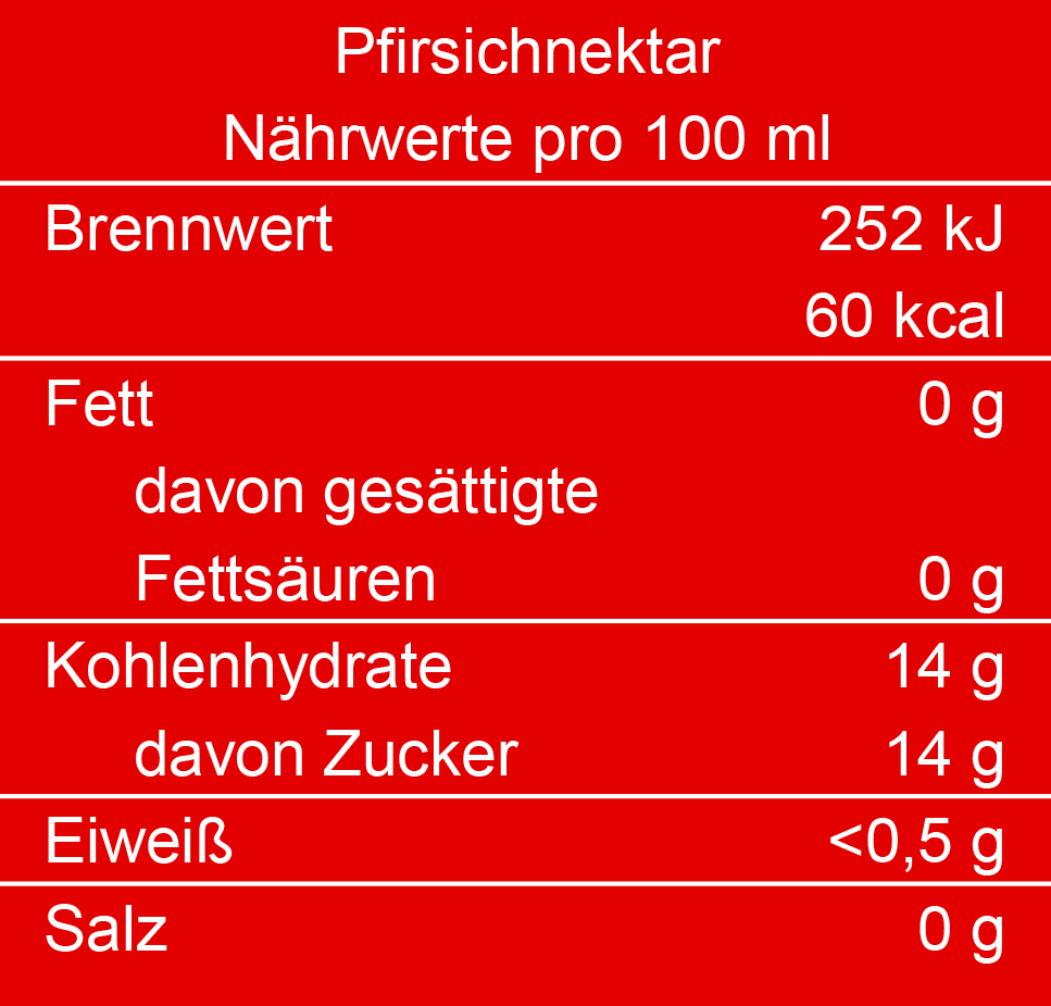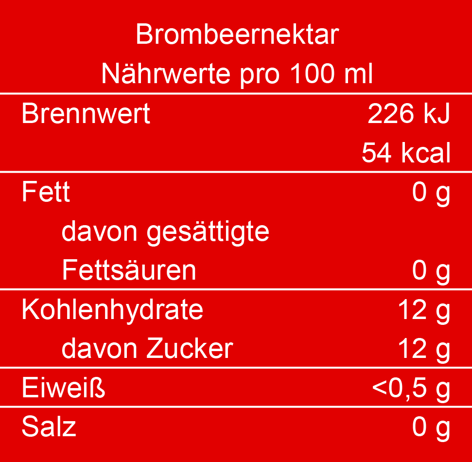 Die naturtrüben Brombeer- und Himbeernektare haben einen Fruchtgehalt von mindestens 40 %, der naturtrübe Pfirsichnektar hat einen Fruchtgehalt von mindestens 50 %, und überzeugen mit unvergleichlich intensivem Geschmack